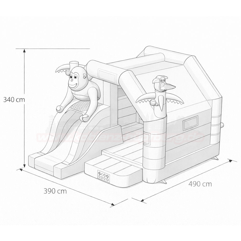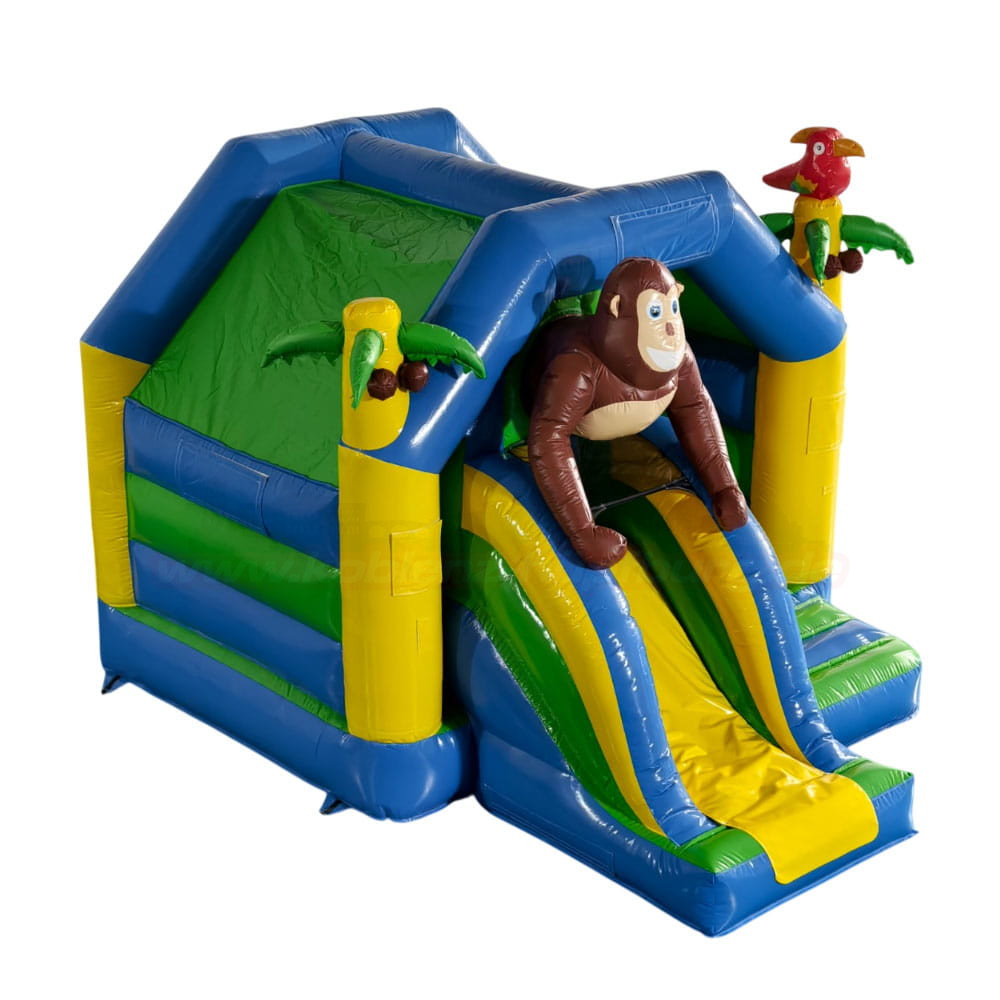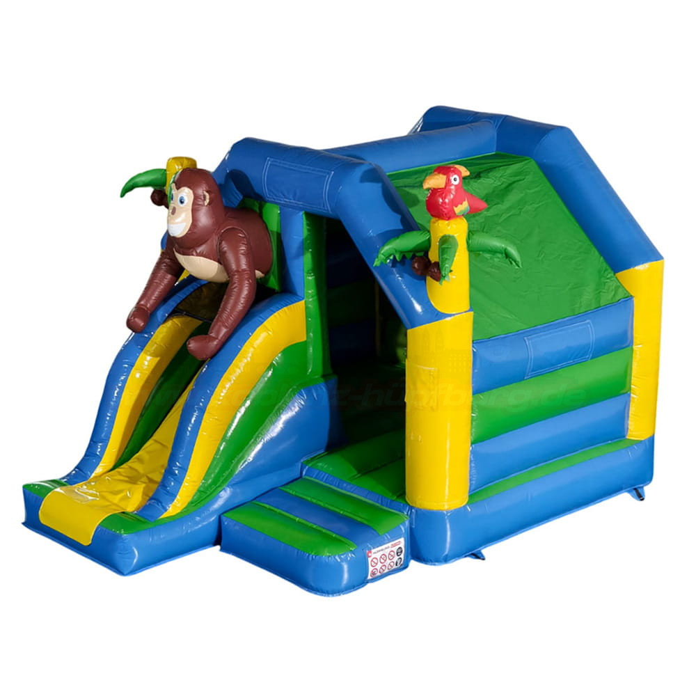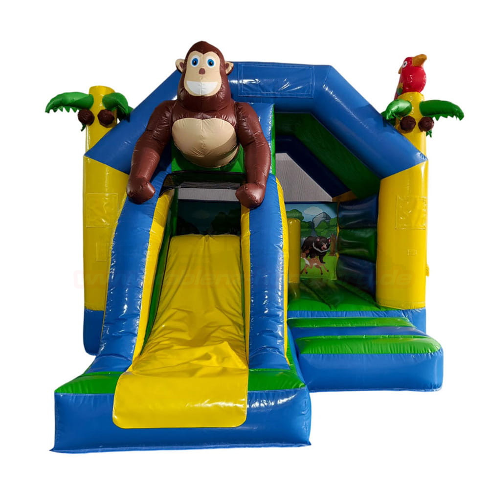Die Hüpfburg Combo Dschungel mit Rutsche bietet doppelten Spaß: Hüpfen und Rutschen in einem! Mit buntem Dschungel-Design, Affenfigur und Papagei ist sie das Highlight auf jedem Kindergeburtstag oder Event in Koblenz. Jetzt bequem online anfragen und selbst abholen!