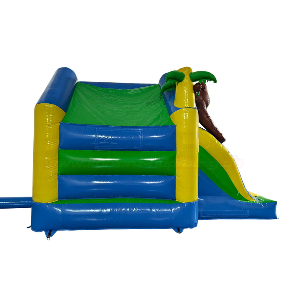Die Hüpfburg Combo Dschungel mit Rutsche vereint gleich mehrere Spielmöglichkeiten in einem Gerät: Hüpfen, Klettern und Rutschen – perfekt für ausgelassenen Spielspaß.
