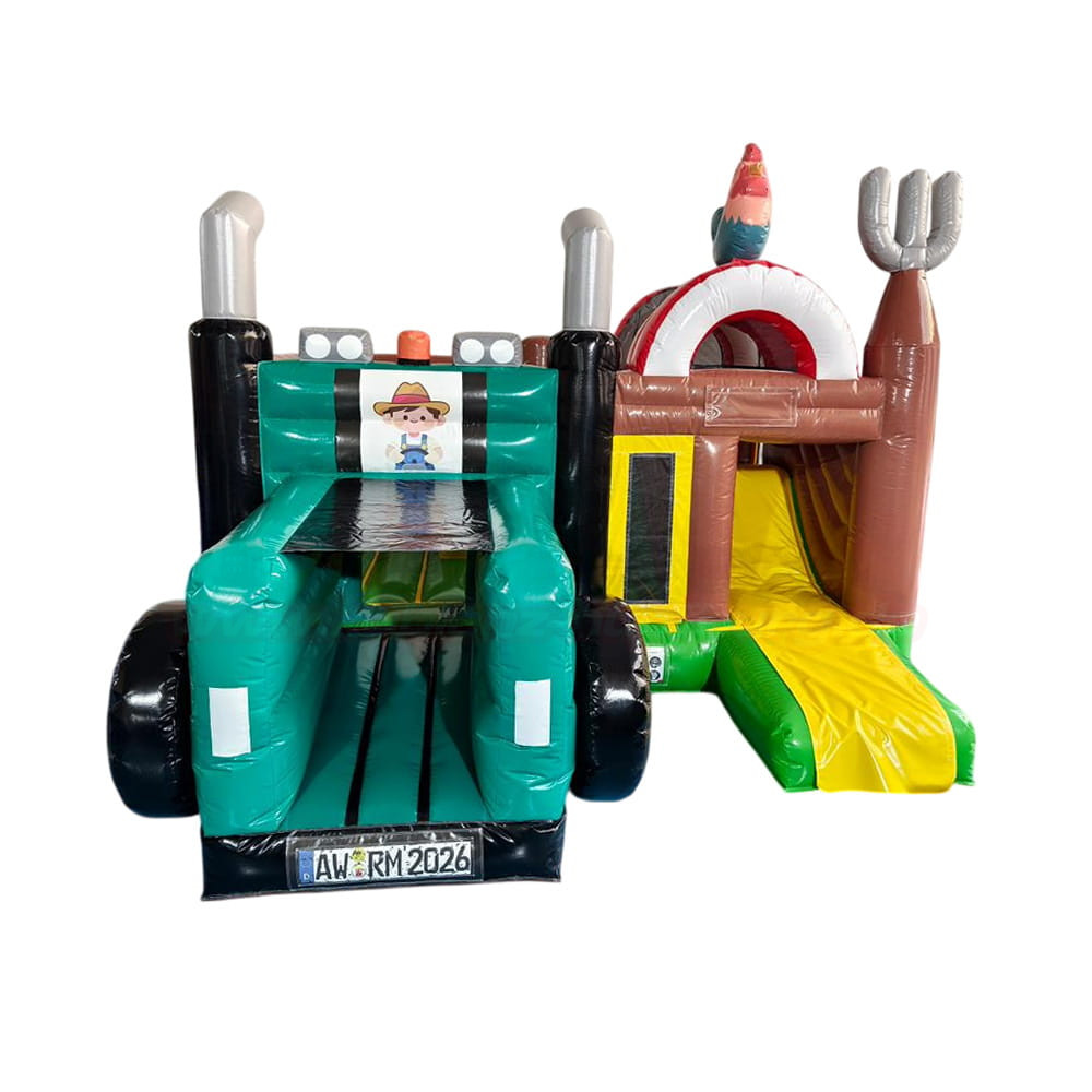 Schon auf den ersten Blick begeistert die Hüpfburg mit ihrem einzigartigen Aufbau: Auf der linken Seite erinnert sie an einen robusten Traktor in sattem Grün mit schwarzen Reifen und einem charmanten Bauernhof-Motiv. Auf der rechten Seite erwartet die Kinder ein separater Bereich mit bunter Rutsche in Gelb, eingerahmt von rustikalen Elementen und dekorativen Details wie einer Heugabel und einem großen Fass. Die Kombination aus Hüpf- und Rutschbereich macht diese Hüpfburg besonders vielseitig und spannend.