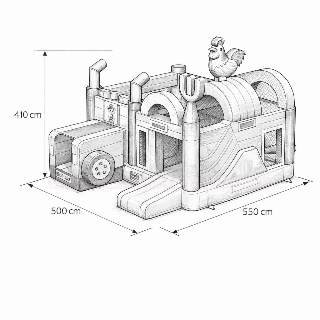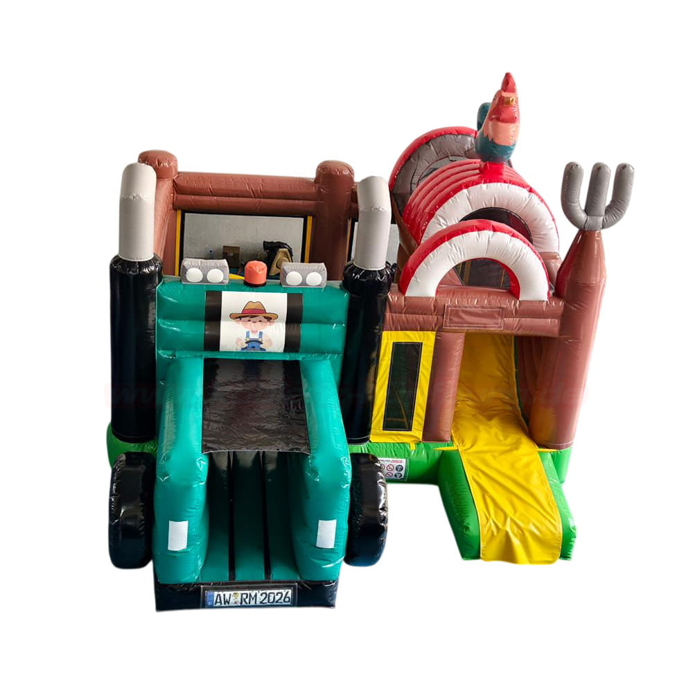 Diese Hüpfburg bringt echtes Bauernhof-Abenteuer direkt auf dein Event! Kinder können sich im großzügigen Hüpfbereich austoben, während die seitliche Rutsche für zusätzlichen Nervenkitzel sorgt. Der Übergang zwischen den Bereichen ist clever gestaltet, sodass Bewegung und Spiel abwechslungsreich bleiben.