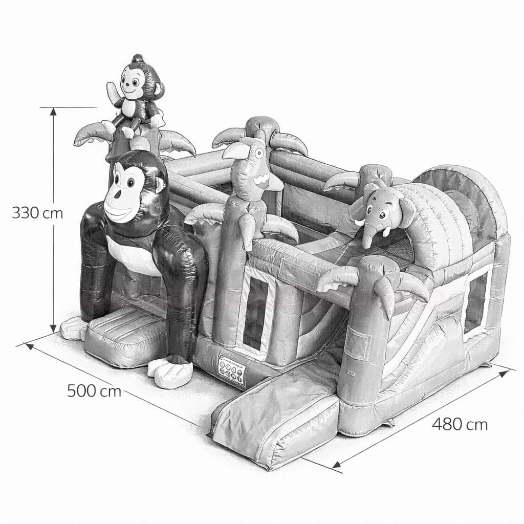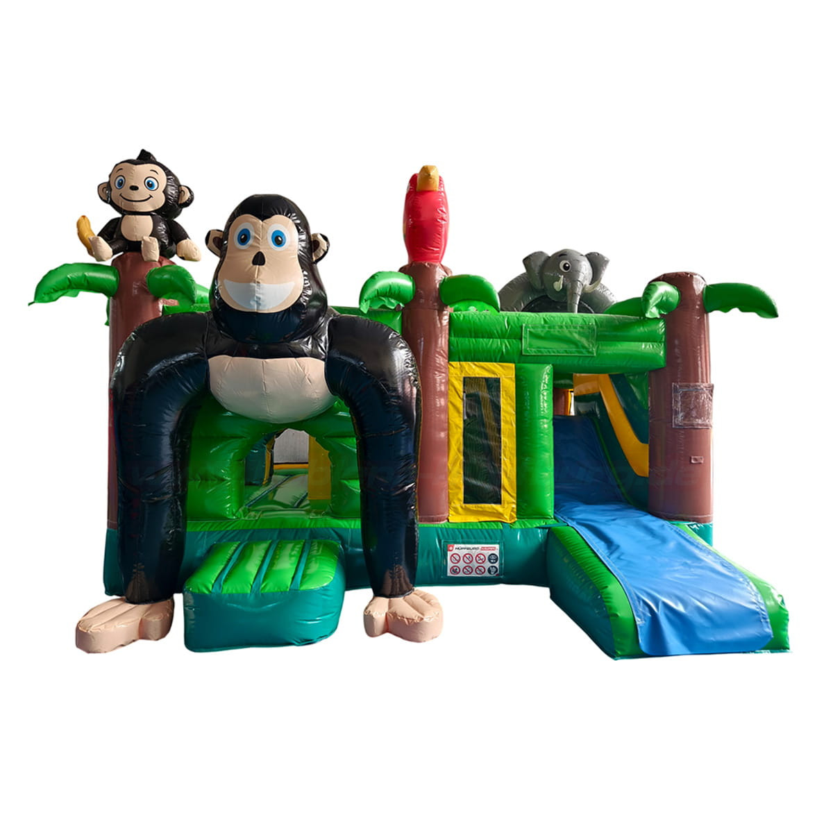 Schon auf den ersten Blick begeistert die Hüpfburg mit ihrem liebevollen Design: Ein großer, freundlicher Gorilla am Eingang, ein bunter Papagei auf einer Palme, ein kleiner Affe auf dem Dach und ein Elefant über der Rutschemachen diese Hüpfburg zu einem echten Erlebnisparadies im Dschungel-Look. Die kräftigen Farben in Grün, Gelb und Braun unterstreichen das Abenteuer-Feeling und passen perfekt zu jeder Outdoor-Party.