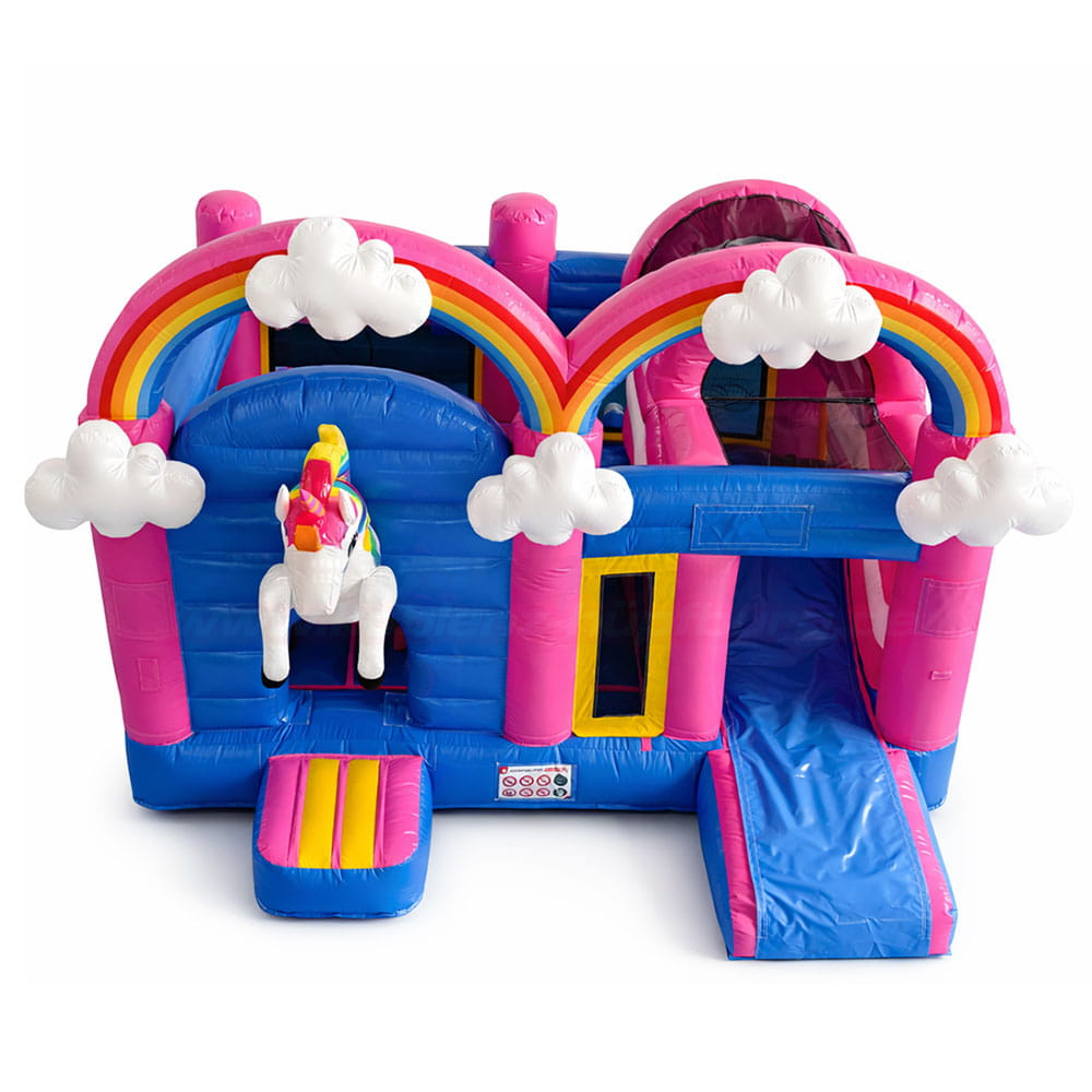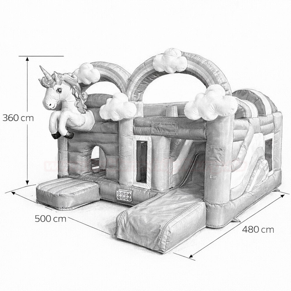 Schon auf den ersten Blick zieht das große, freundliche Einhorn mit bunter Regenbogenmähne alle Aufmerksamkeit auf sich. Zwei imposante Regenbogenbögen mit weißen Wolken spannen sich über die Hüpfburg und schaffen eine fantasievolle Erlebniswelt, die Kinder sofort zum Spielen einlädt.