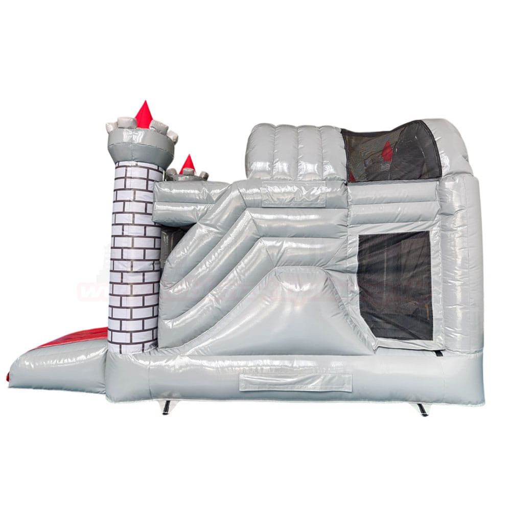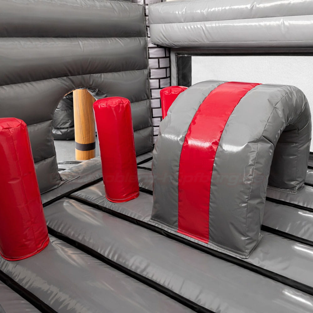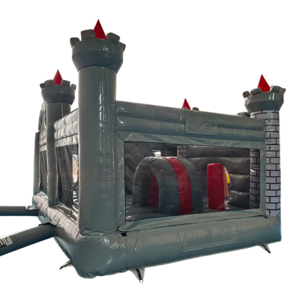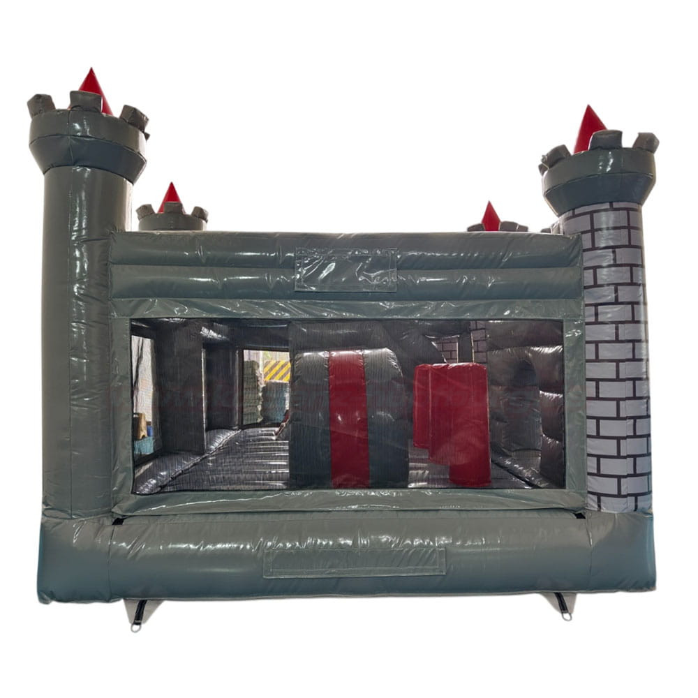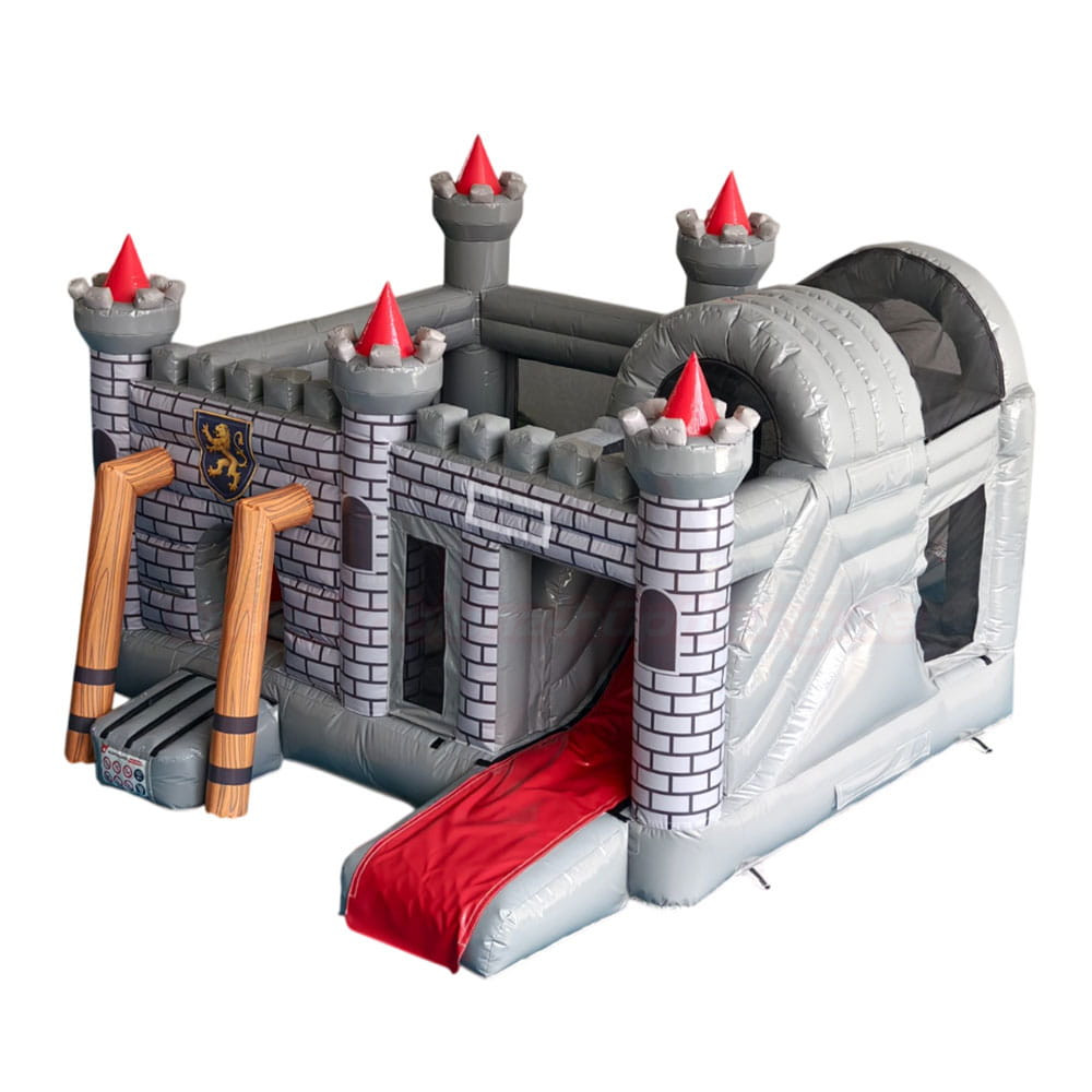 Schon auf den ersten Blick begeistert die Hüpfburg durch ihre detailreiche Burgoptik: Graue „Steinmauern“, vier markante Türme mit roten Spitzen und ein stilvolles Wappen sorgen für echtes Ritterfeeling. Der Eingang wird von aufgedruckten Holzbrücken-Elementen eingerahmt, was den Eindruck einer echten Zugbrücke verstärkt – ein echter Hingucker für jedes Event!