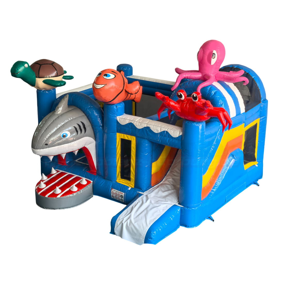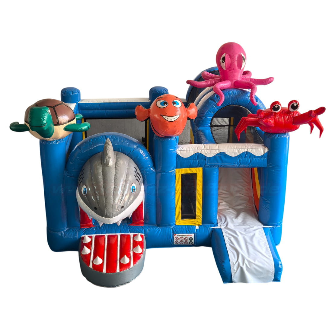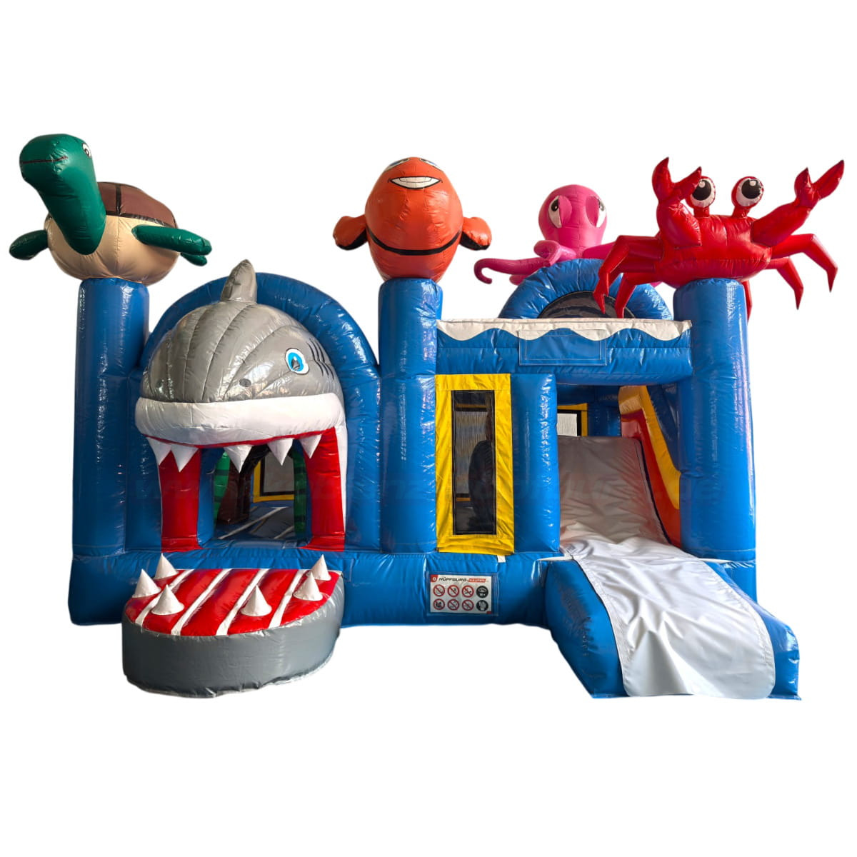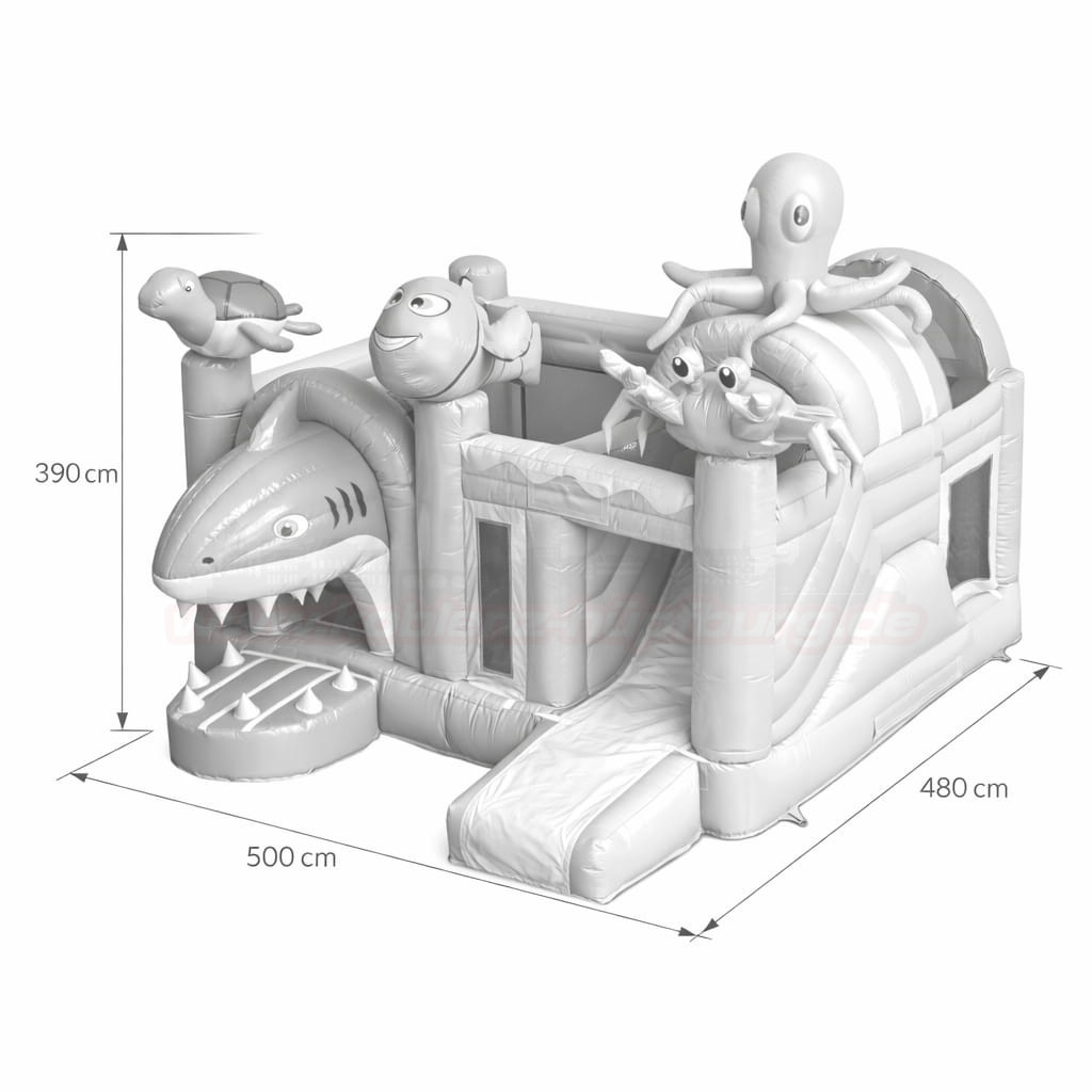 Schon auf den ersten Blick fällt das außergewöhnliche Design ins Auge: Ein großer, freundlich gestalteter Hai mit geöffnetem Maul bildet den Eingangsbereich, während eine grüne Schildkröte, ein lächelnder Clownfisch, ein roter Krebs und ein pinker Oktopus die Hüpfburg dekorieren. Die Kombination aus kräftigem Blau, bunten Regenbogenfarben und maritimen Figuren schafft eine spielerische und einladende Atmosphäre.