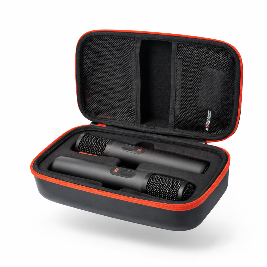 Dieses hochwertige JBL Bluetooth Mikrofon-Set besteht aus zwei eleganten, schwarzen Handmikrofonen mit roten Akzenten, einem passenden Empfänger mit Klinkenanschluss sowie einem stabilen, gepolsterten Transportkoffer mit Reißverschluss.
