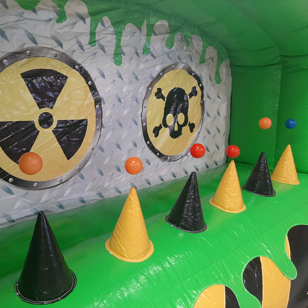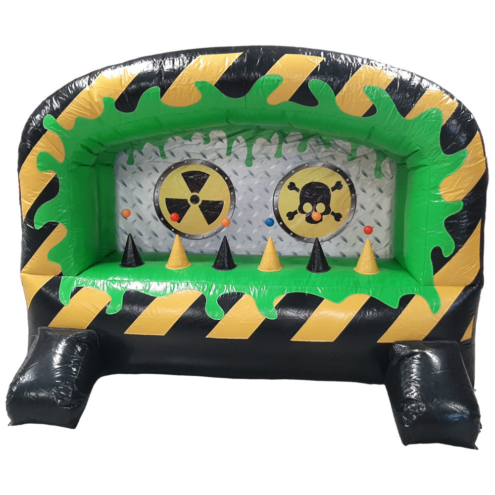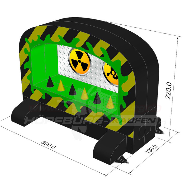 Mit ihrem auffälligen schwarz-gelben Gefahrenstreifen-Design, dem leuchtend grünen Rahmen und den zwei großen Zielscheiben im „Nuklear-Look“ ist diese Schiessbude ein echtes Event-Highlight. Perfekt für spannende Wettkämpfe, lustige Challenges und jede Menge Spaß!